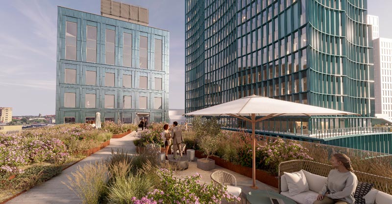 On the 8th floor, you step out onto a lush terrace with beautiful views. Here you will find a peaceful and secluded spot, perfect for after-work gatherings, events, or other social occasions.